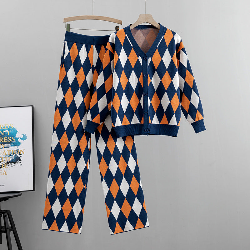 Női őszi kockás alkalmi kötött kardigán és nadrág kétrészes szett