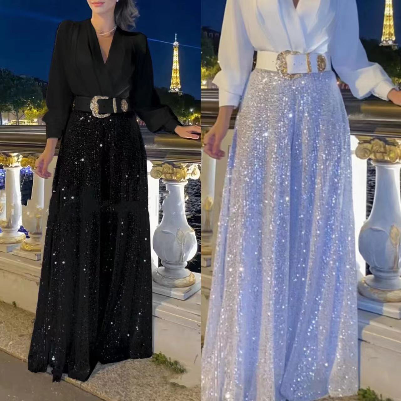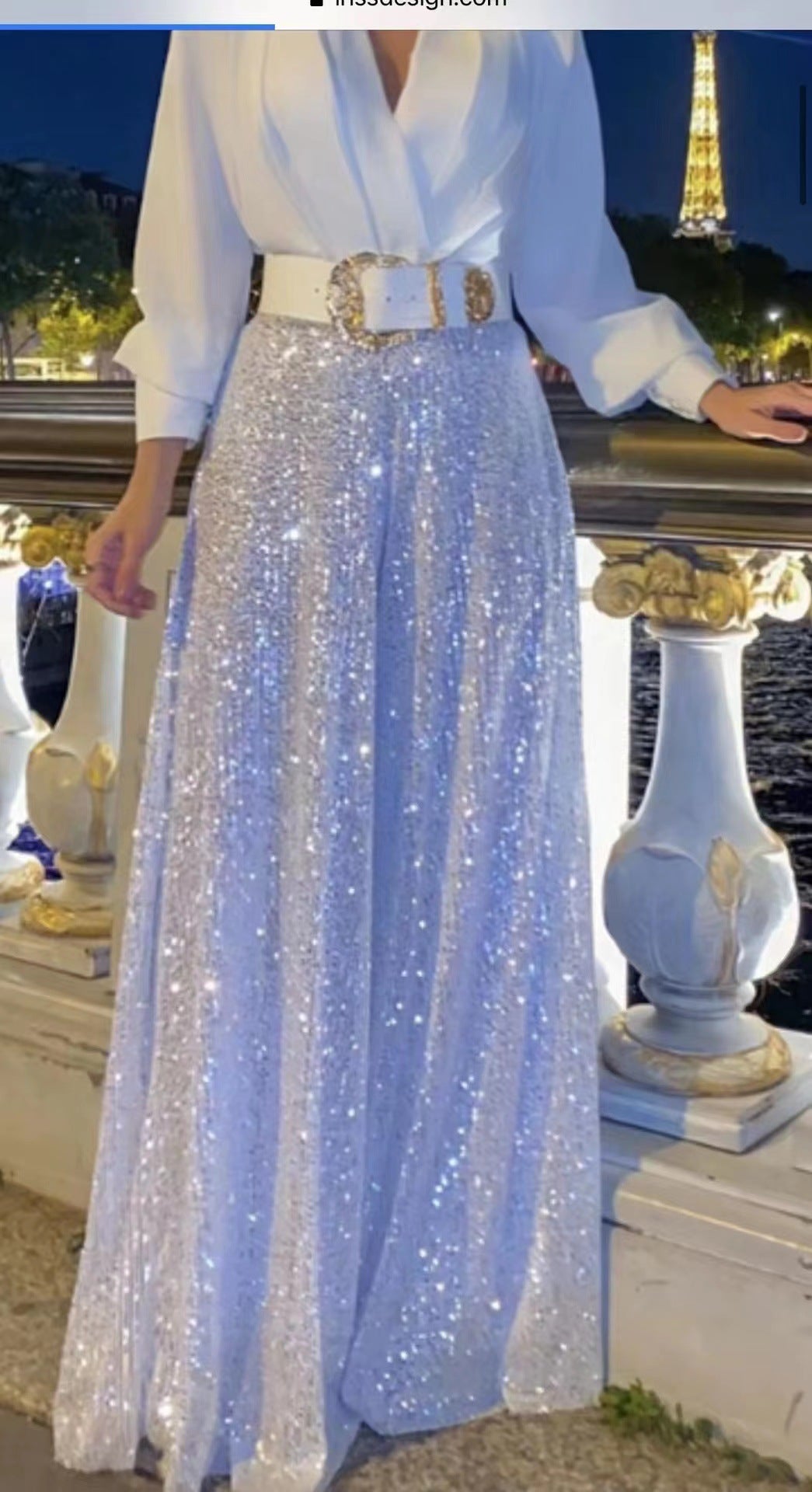 Új divatos V-nyakú, hosszú ujjú flitteres ing, széles szárú nadrág, kétrészes szett
