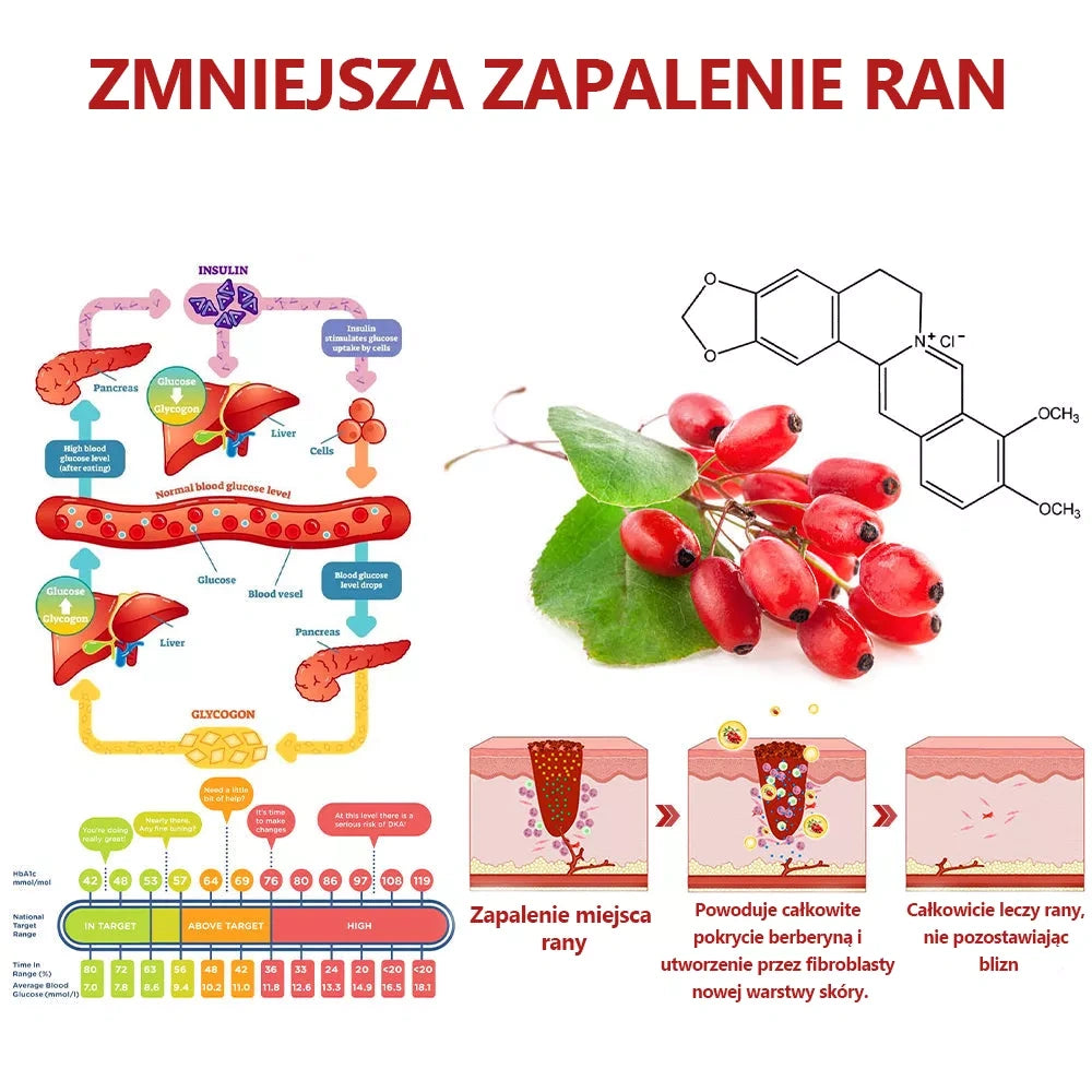 Berberin - gyulladásgátló tulajdonságokkal rendelkezik, gátolja a gyulladásos faktorok termelődését és csökkenti a gyulladást a seb helyén. Támogatja a sebgyógyulást azáltal, hogy serkenti a fibroblasztok és keratinociták szaporodását, felgyorsítja az új sejtek növekedését és regenerálódását. Gátolhatja a baktériumok szaporodását a sebben és csökkentheti a fertőzés kockázatát, ami felgyorsítja a sebgyógyulási folyamatot. A glükóz felszabadulás csökkentésével a berberin segíthet a vércukorszint jobb szabályozásában.
