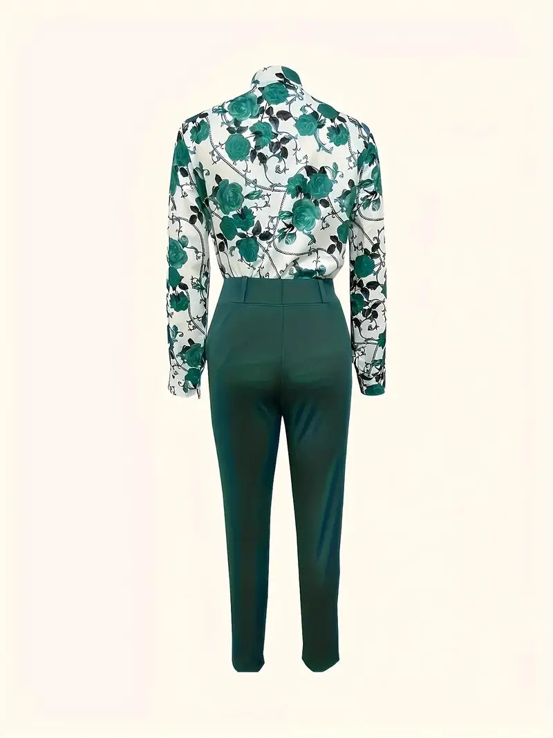 Elegáns kétrészes szett – Virágos blúz, öves nadrág, V-nyakkivágás.