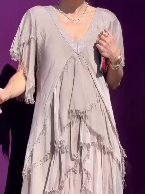 Ez az elbűvölő maxi ruha elasztikus V-nyakkivágással, egyenes melltartóval és négy réteg fodrokkal rendelkezik, amelyek szerény midi szegélyre esnek. Ez határozottan egy meghatározó darab
