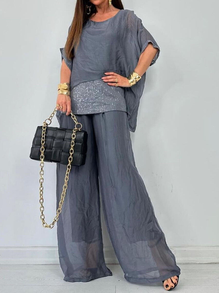 [S-3XL] 2024 Új nyári sifon legénységi nyakú rövid ujjú varrott nadrág alkalmi szett