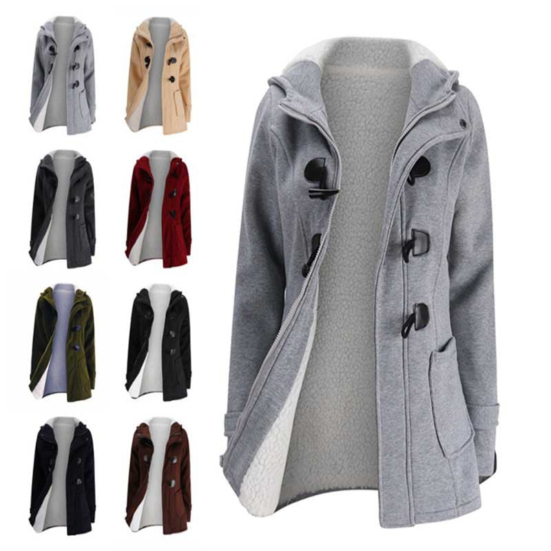 JiangWu női polár dzseki szarvgombbal és kapucnival, téli meleg kabát