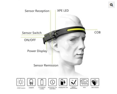 - elülső zseblámpa, horgászat, kempingezés, túrázás, mozgásérzékelővel, vízálló esőálló, COB és XPE led szalag