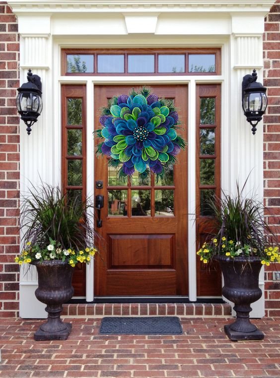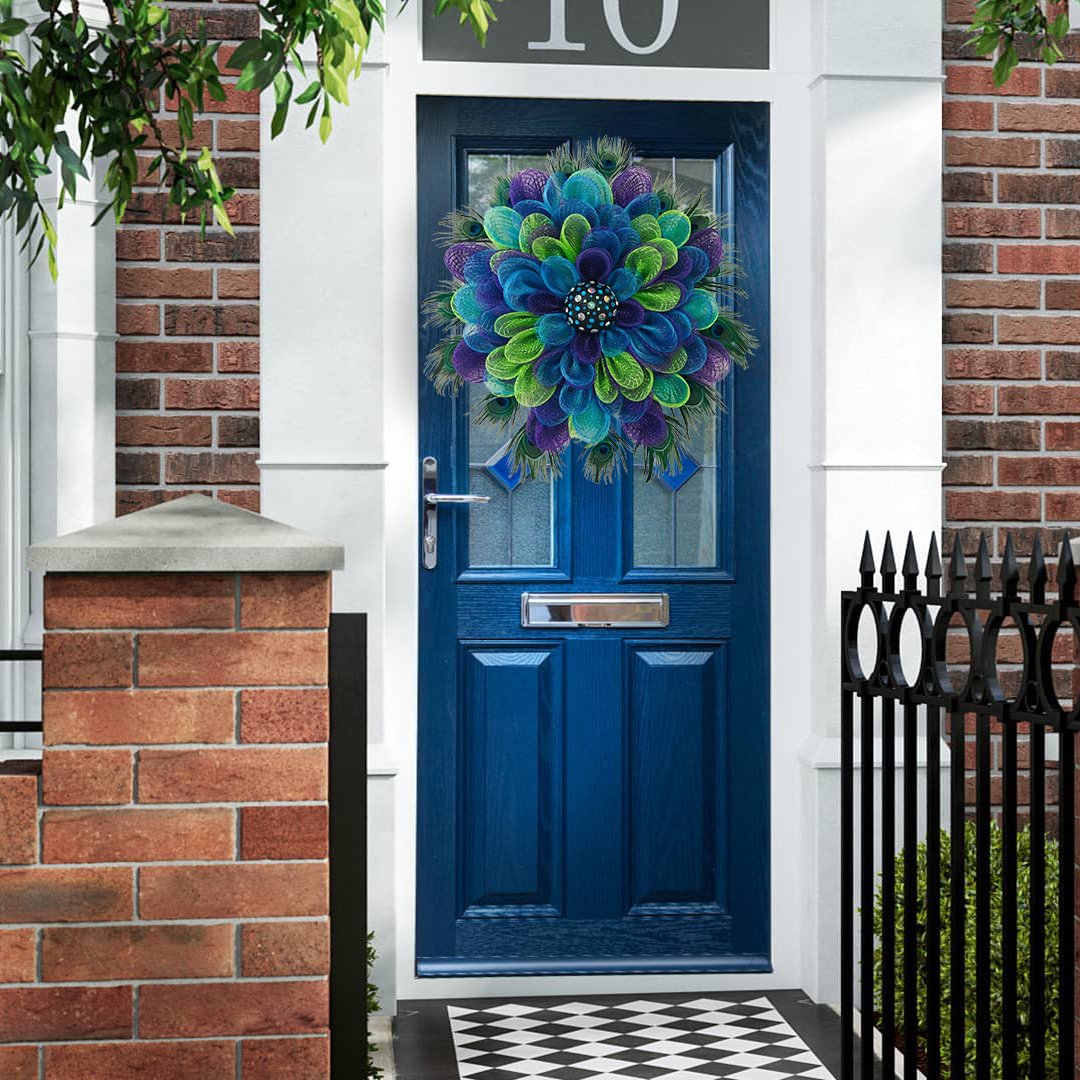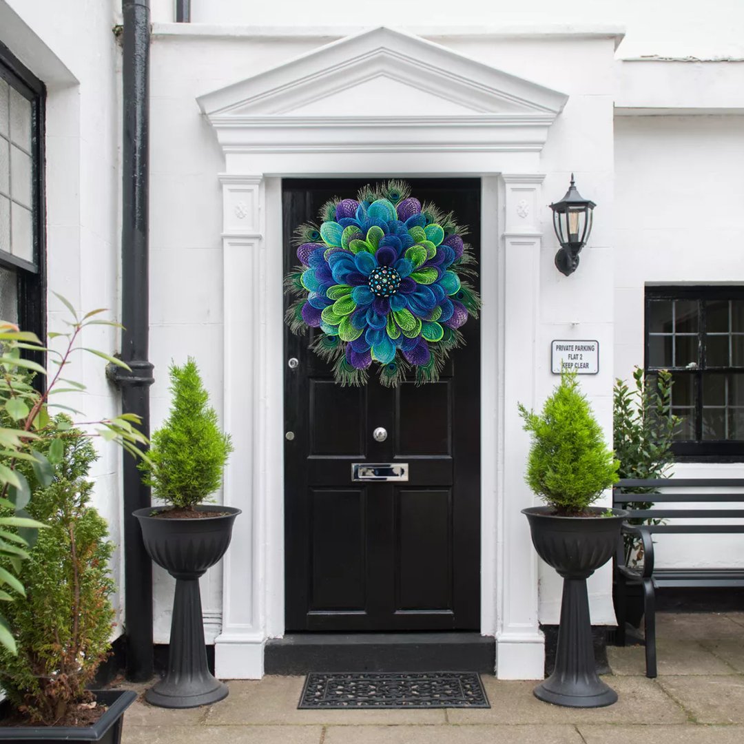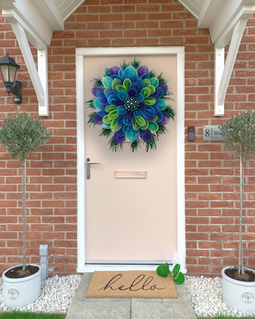 Ez a koszorú gyönyörű páva színekkel rendelkezik, mindenki figyelmét leköti, ideális ajtónak, falnak, szabadban is felakasztható.