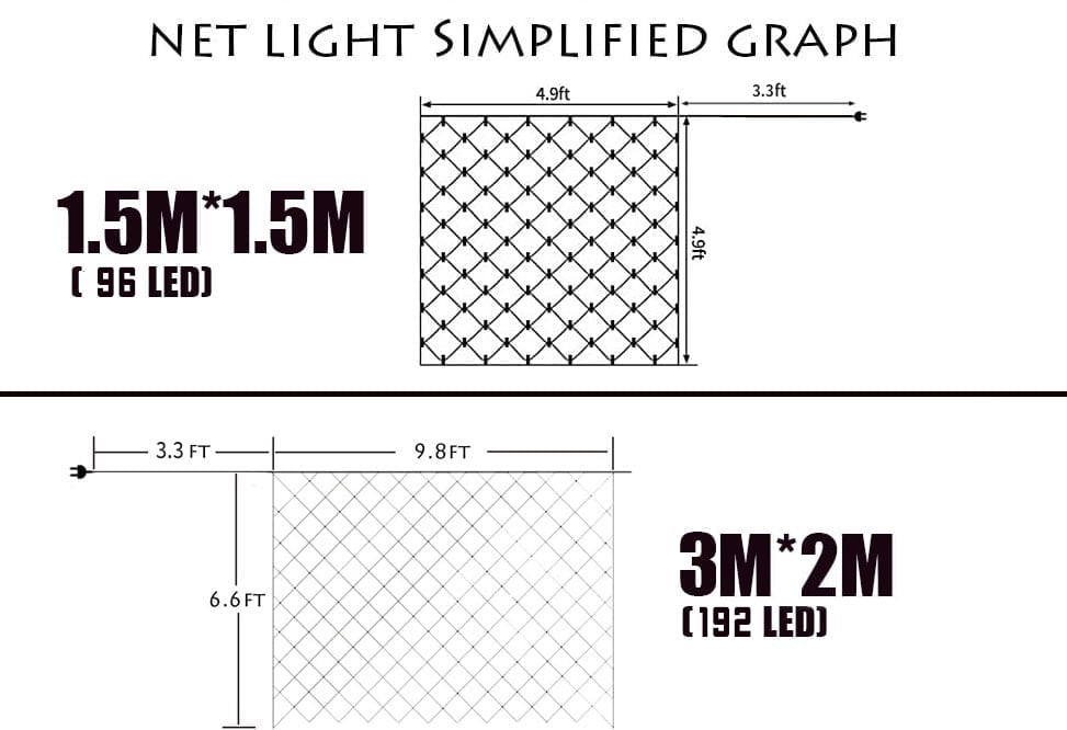 8 mód memória funkcióval: Ez a hálós karácsonyi lámpa 8 különböző üzemmóddal rendelkezik. Kombinált, Hullámos, Soros, Slo-glo, Chase, Slow Fade, Flash és Stay. A hálózati fényadapter egy beépített memóriachip, amely elmenti az utolsó módbeállítást, és nem kell minden nap visszaállítani az üzemmódot