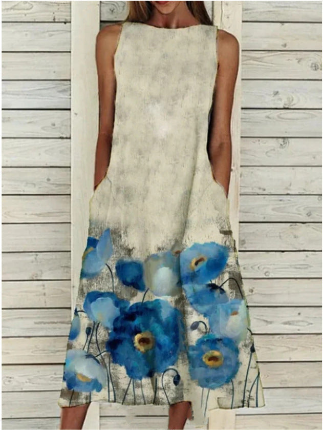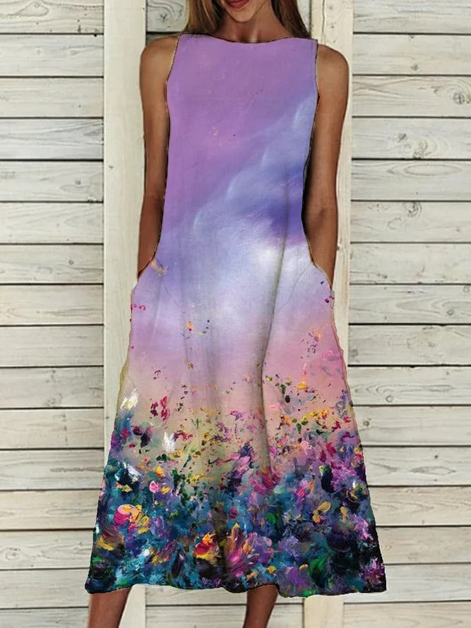 Stílus: Nagy méretű női virágos ujjatlan midi ruha, női alkalmi virágmintás lenge ruha, virágos, középhosszú női ruha, nyakkendővel festett, ujjatlan női strandruha.
