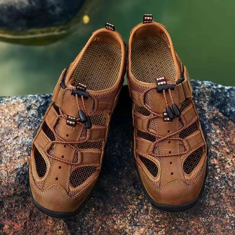 Új Baotou ütközésgátló bőr szandál lapos cipő légáteresztő alkalmi cipő