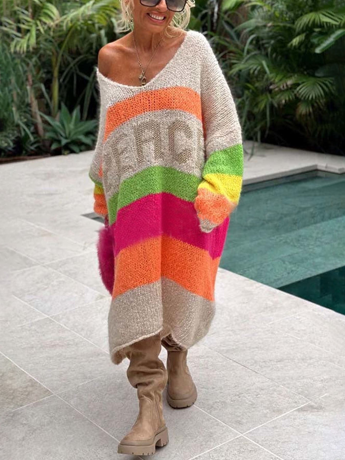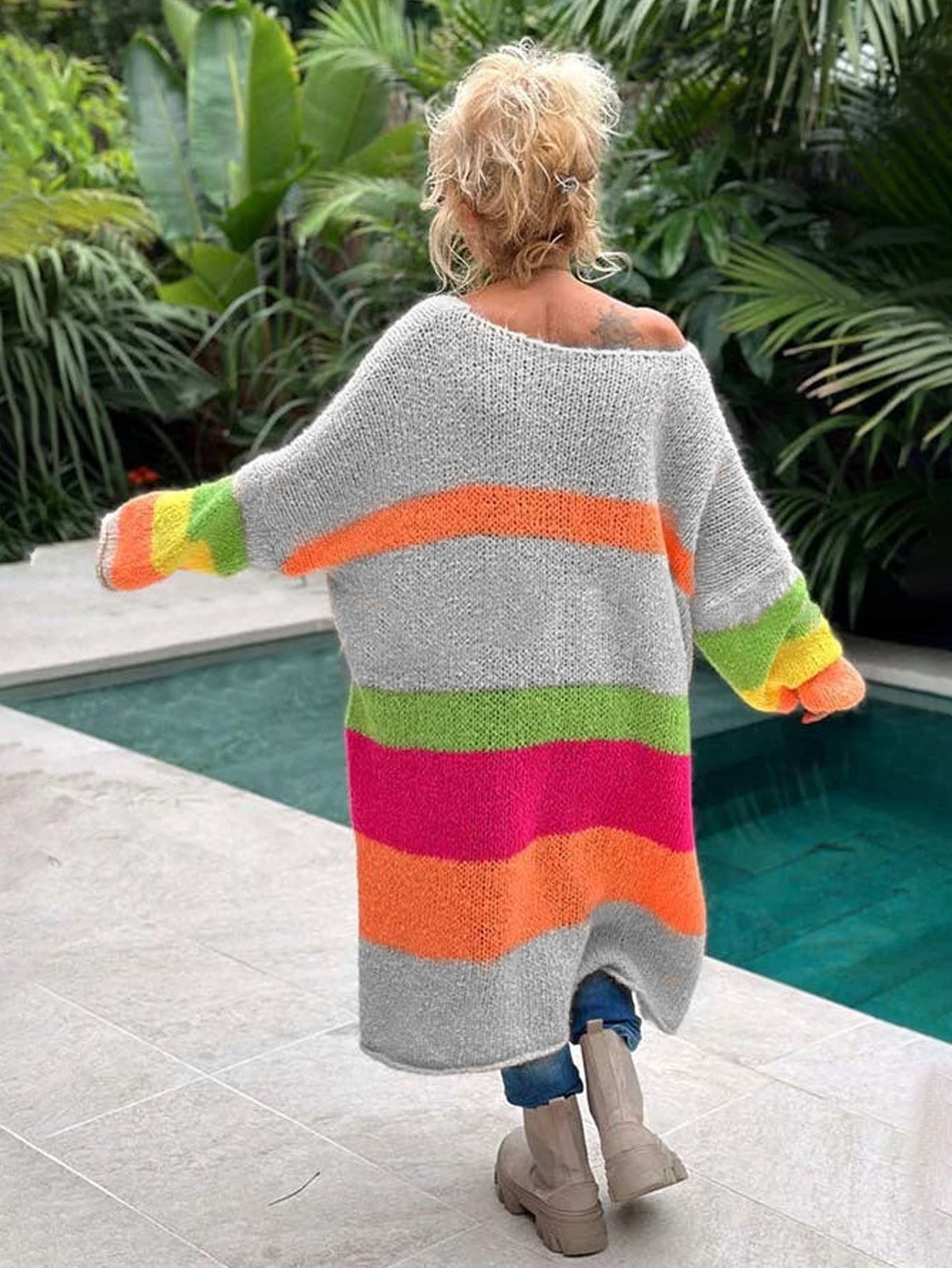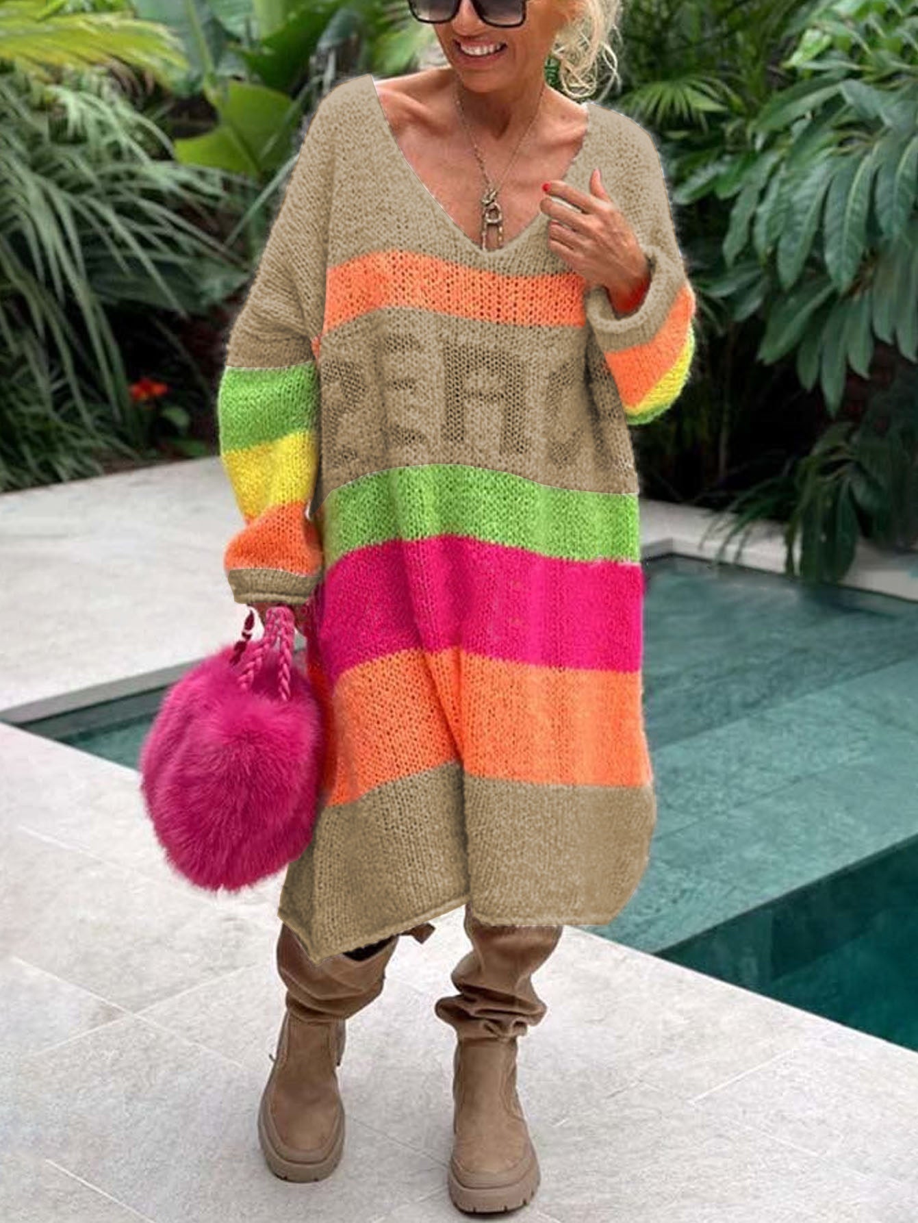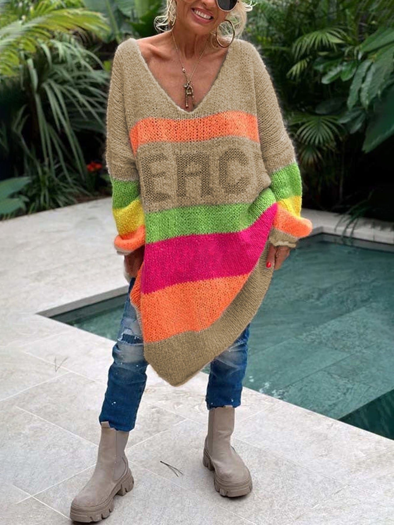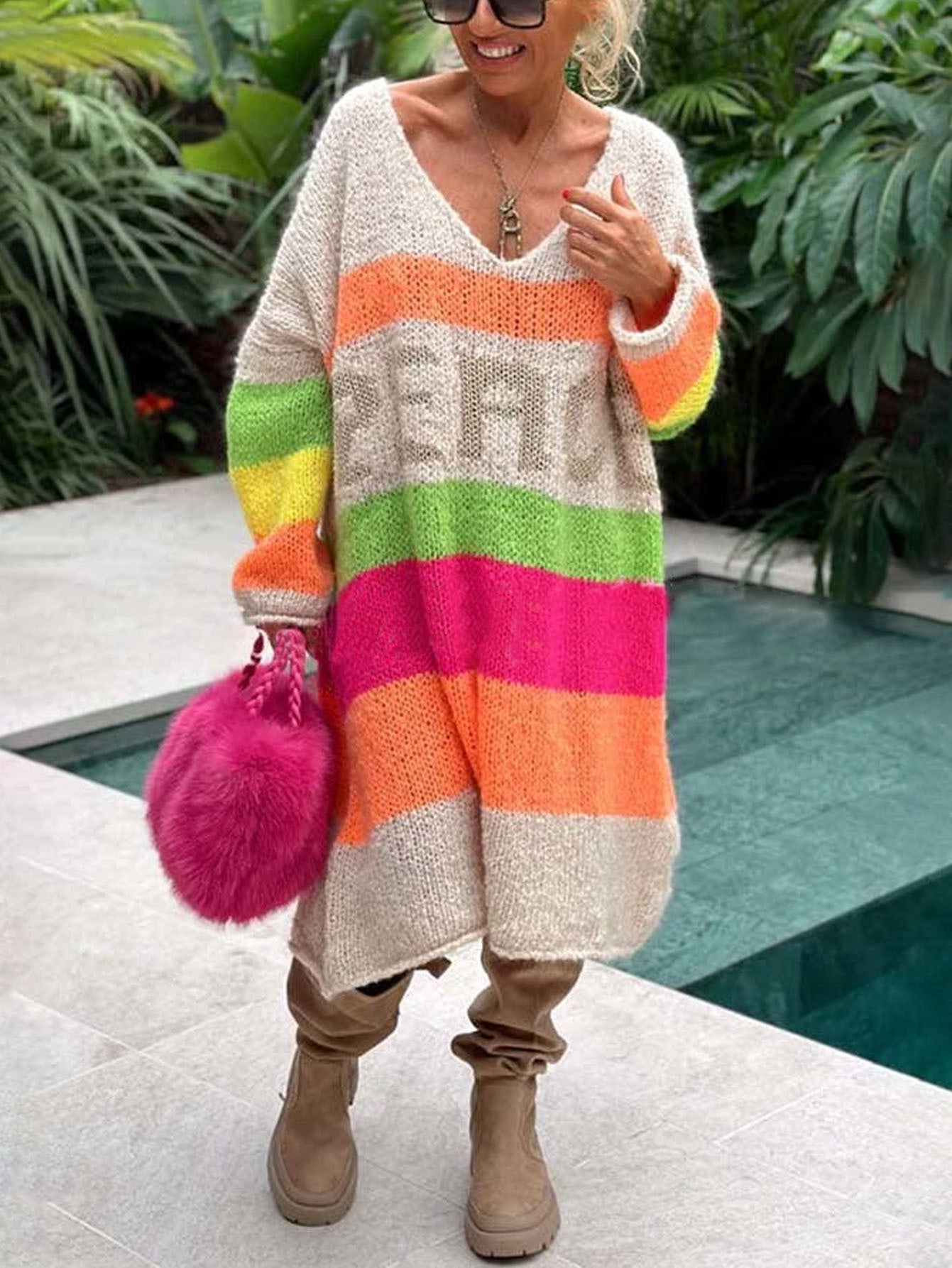 ez a szivárványcsíkos pulóver sokoldalú kiegészítője ruhatárának, és könnyen viselhető bármilyen alkalomra. Ez a pulóver élénk irizáló színekkel és klasszikus kötöttséggel rendelkezik a játékos, mégis stílusos megjelenés érdekében.