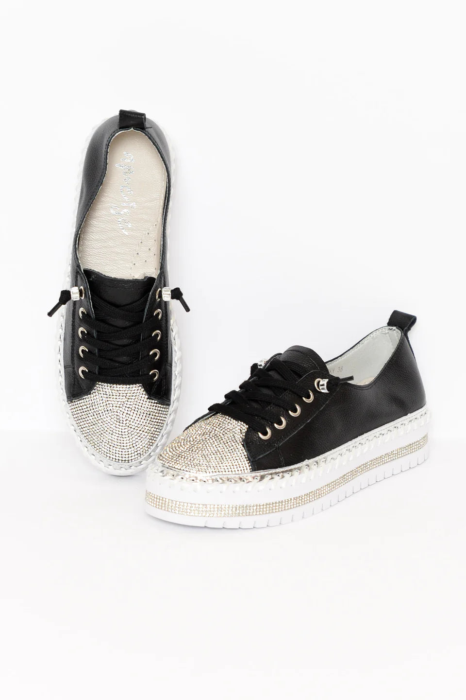 Strassz csíkok, fémes ezüst csíkok és vaskos látható varrások díszítik a talpat az egyedülállóan stílusos érintés érdekében