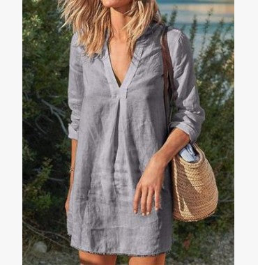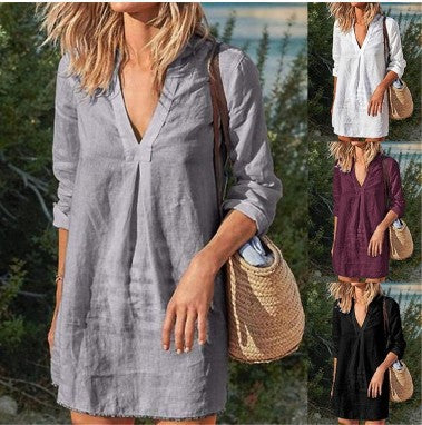 Divatos, közepes hosszúságú lezser vászon pamut ruha