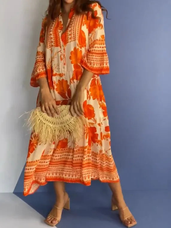Divatos, modern virágmintás ünnepi napi nyomtatott ruha V-nyakú, 3/4 ujjú