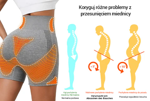 Te połączone terapie pomagają w rozluźnieniu napiętych mięśni wynikających z przemieszczenia miednicy, zmniejszają dyskomfort i poprawiają stabilność rdzenia. Noszenie tych szortów przez dłuższy czas może przyczynić się do korygowania postawy miednicy, przywracając ciało do jego naturalnej fizjologicznej pozycji oraz poprawiając ogólną postawę i komfort.